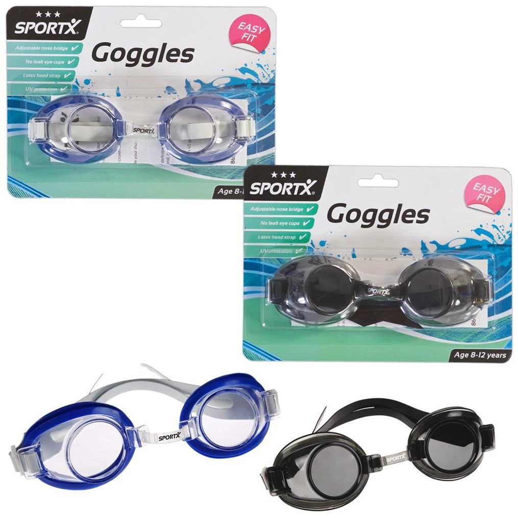 SportX Junior zwembril, kwaliteit drie sterren, met comfortabele anti-lek pasvorm, verstelbare hoofdband en neusbrug, veiligheidslenzen, UV-bescherming en latex hoofdband.